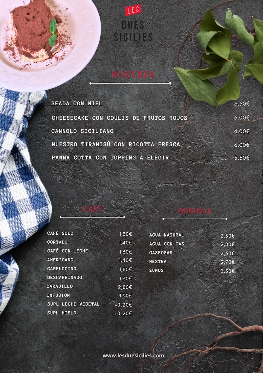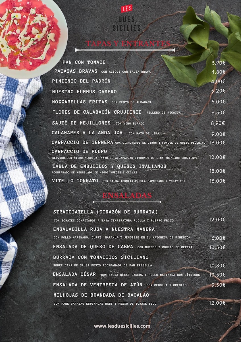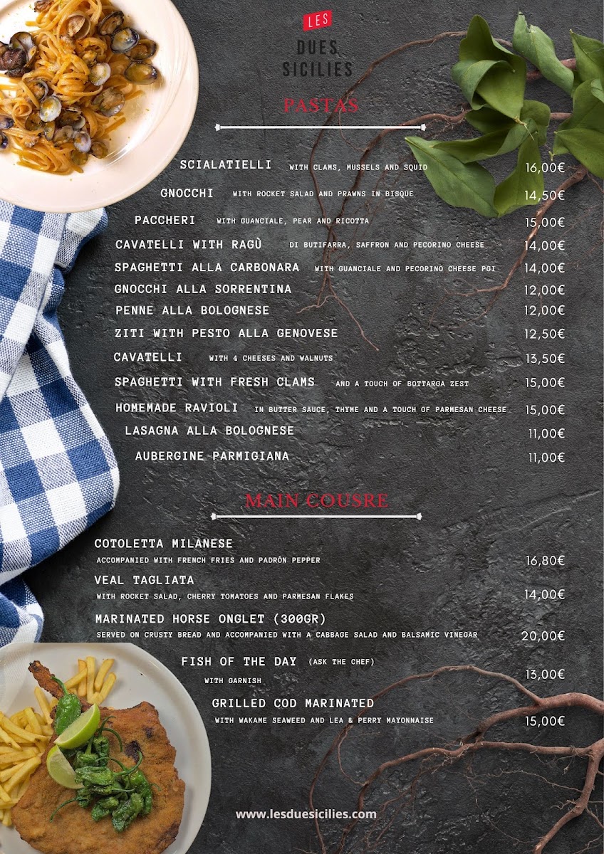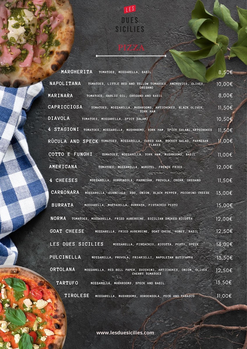 Welcome to Les dues Sicílies, a delightful culinary gem nestled in the heart of Barcelona's Ciutat Vella. This charming eatery offers an exquisite menu that captures the essence of Italian cuisine with a Sicilian twist. Each dish is crafted to perfection, from the classic Margherita pizza, boasting fresh mozzarella and aromatic basil, to their signature Dues Sicilies pizza topped with rich pistachio, mascarpone, and speck.